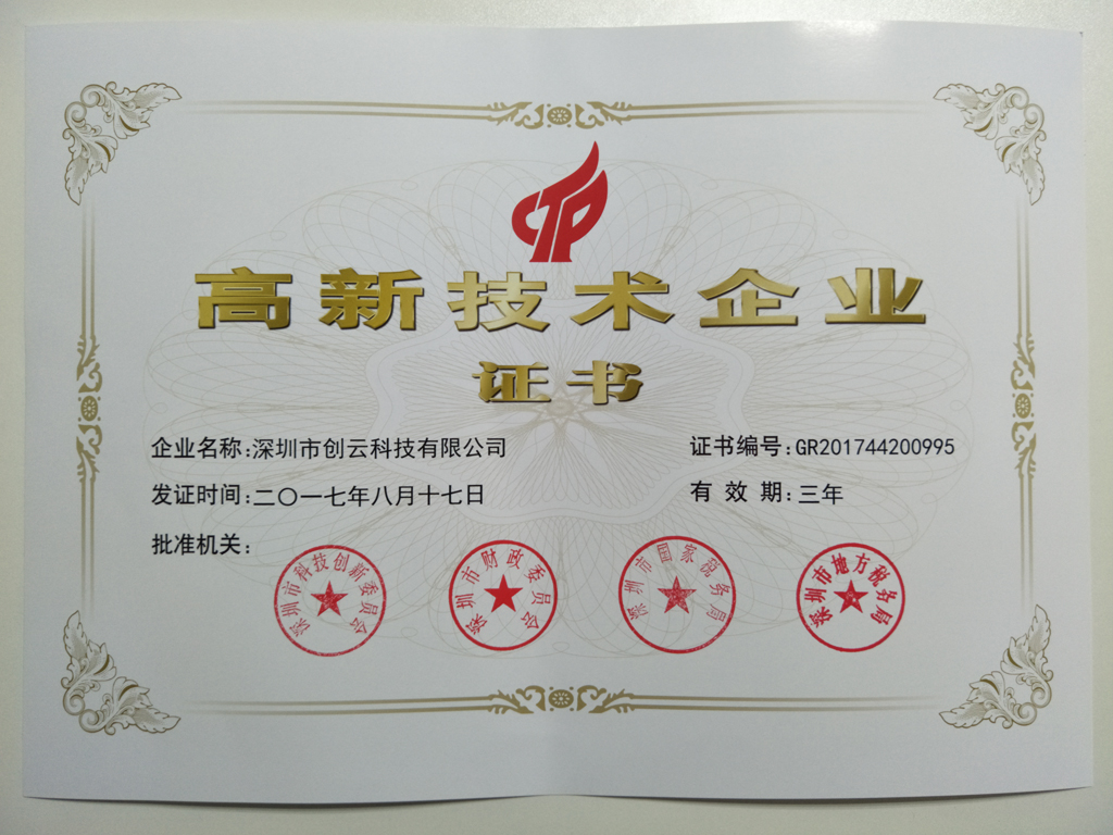 日前,高新企业认定管理工作网发布了深圳市2017年第二批国家高新技术企业认定名单,深圳市创云科技有限公司顺利通过认定,荣获国家高新技术企业荣誉称号。